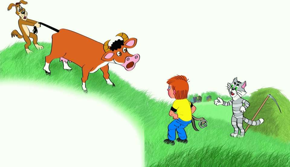 Но дядя Фёдор всё коту объяснил. И занавесочки показал объеденные. А пёс корову за хвост держит – мало ли что!