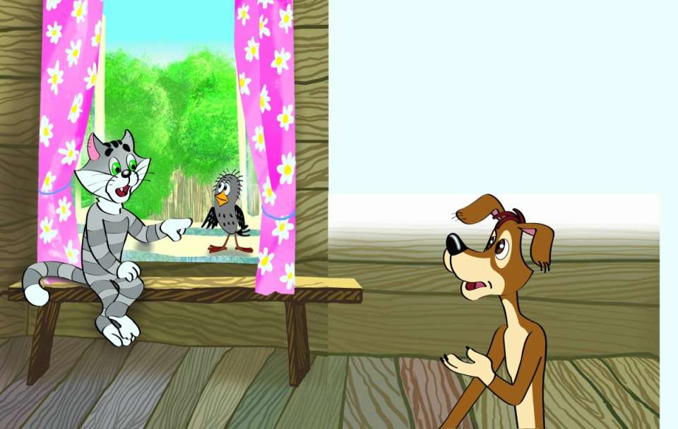 Достал он косу и пошёл сено на зиму запасать. А корова к окну подошла. На окне занавесочки были. Она взяла и все занавесочки съела. И все цветы, которые в горшках стояли. Пёс увидел и говорит:
