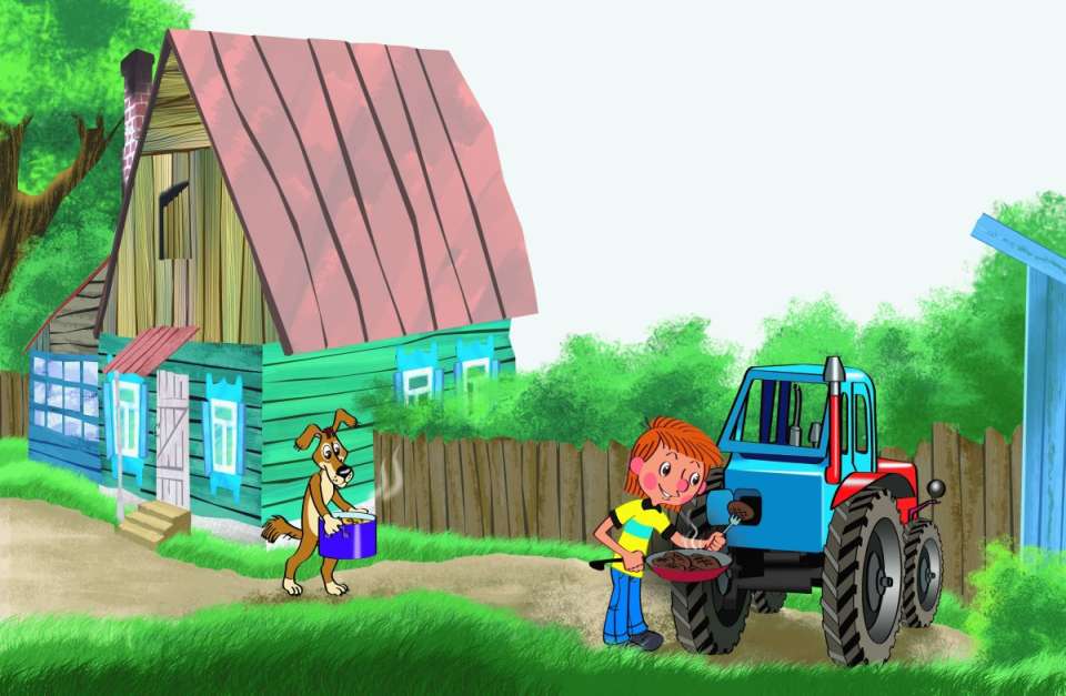 Он ушёл. А мальчик с Шариком стали тр-тр заводить. Стали в трактор суп заливать и котлеты запихивать. Прямо в бак. Трактор как затарахтит!