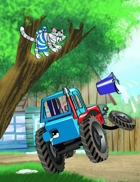 Так они и сделали. И скоро трактор исправляться начал. А вообще-то он был весёлый. Кабина пластмассовая, голубая, а колёса железные. И смазывать его надо было не машинным маслом, а подсолнечным.