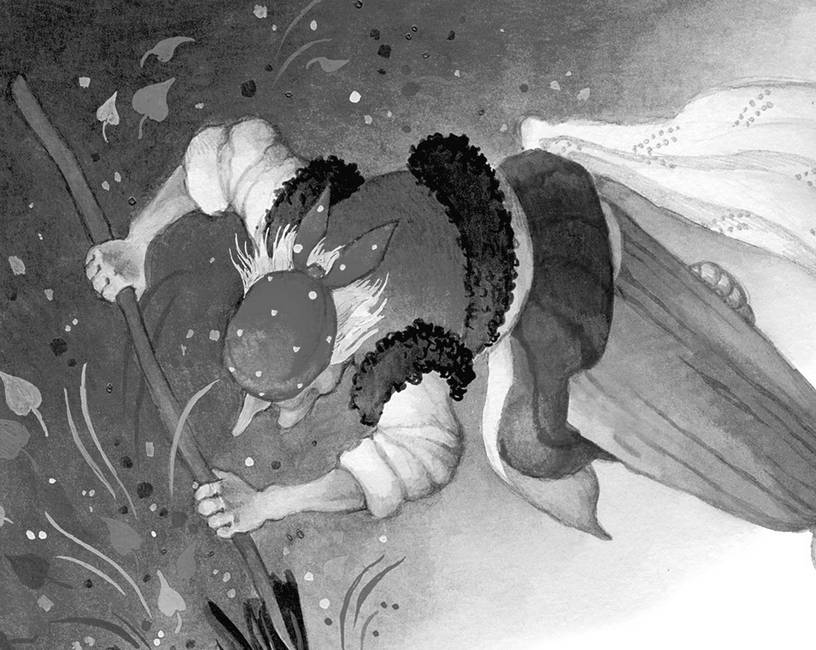 Дверь со стуком распахнулась, Баба Яга в ступе вихрем вылетела из избушки. В руках у неё была метла. Удары так и посыпались на незадачливого грабителя. Баба Яга залетала то справа, то слева, и её метла мелькала так быстро, что только и слышно было: бум! Бум-бум-бум-бум!.. Бум-бум!.. Бум! Трах!