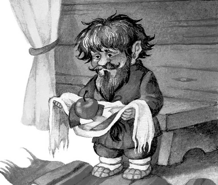 Баба Яга подала ему осколки блюдечка, и Домовой принялся за работу. Сам он был маленький, а руки у него большие и красные. В них легко мог спрятаться целый рубанок. Но этими руками он умел делать всё. Через полчаса блюдечко стало как новое. Дядюшка вытер его чистым кухонным полотенцем и поставил на стол. Потом он тихонько запустил в него наливное яблочко.