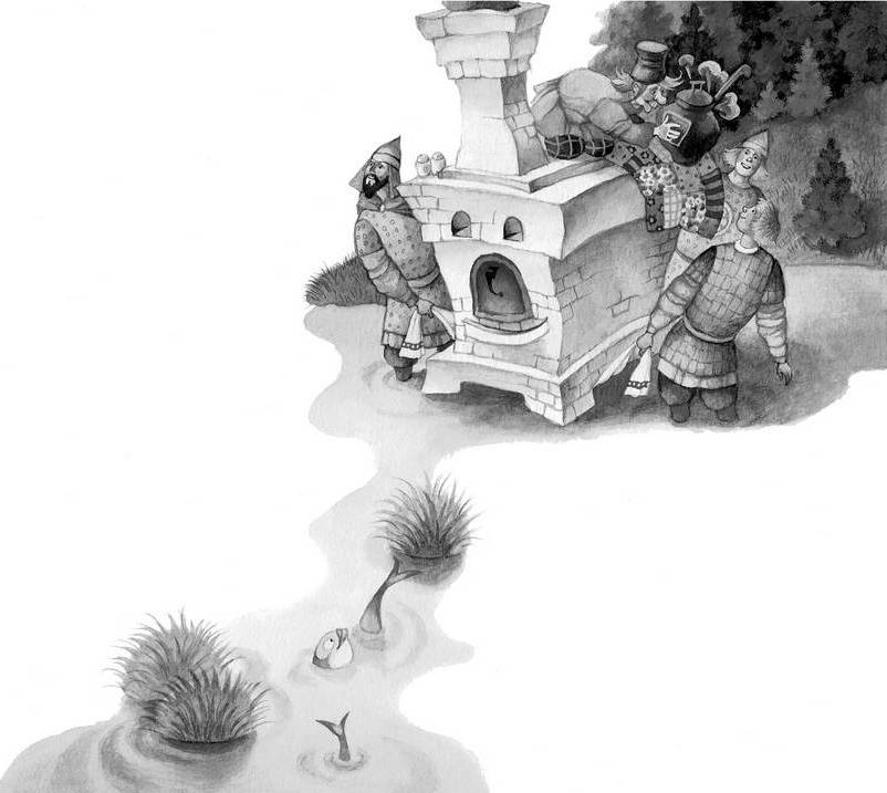 – А и верно, добры молодцы! – заметила Василиса Премудрая. – Чем смеяться попусту, показали бы силу молодецкую! Вытащили бы печку из реки!
