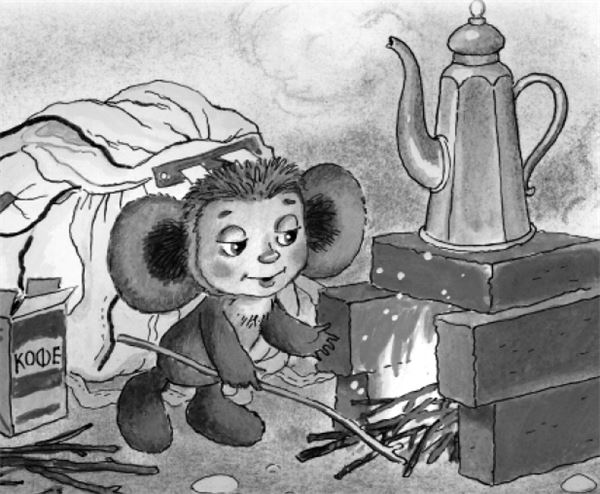 Гена взялся за работу. Он собрал дрова, развёл маленький костёрчик около будки и поставил кофейник на огонь. Через полчаса кофе вскипел. Чебурашка был очень доволен.
