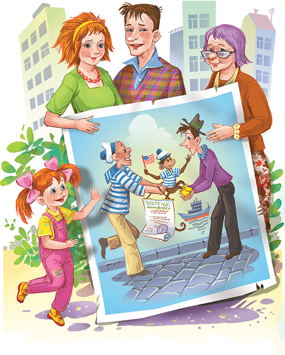 – Нисколько не надо. Наоборот, я вам ещё и страховой полис дам. Эта обезьянка застрахована. Если с ней что-нибудь случится: заболеет или потеряется, – вам страховая компания за неё целую тысячу долларов заплатит.