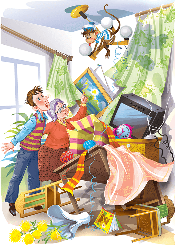 – Если вся мебель в квартире вверх ногами, это сюрприз? И точно: все табуретки, все столы и даже телевизор – всё в квартире вверх ногами поставлено. А на люстре обезьянка висит и электрические лампочки облизывает.