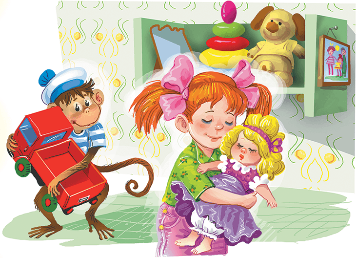 Бабушка в комнату заглянула. Видит – Вера ходит, большую куклу Лялю укачивает. А за ней по пятам Анфиса ходит и большой грузовик качает.