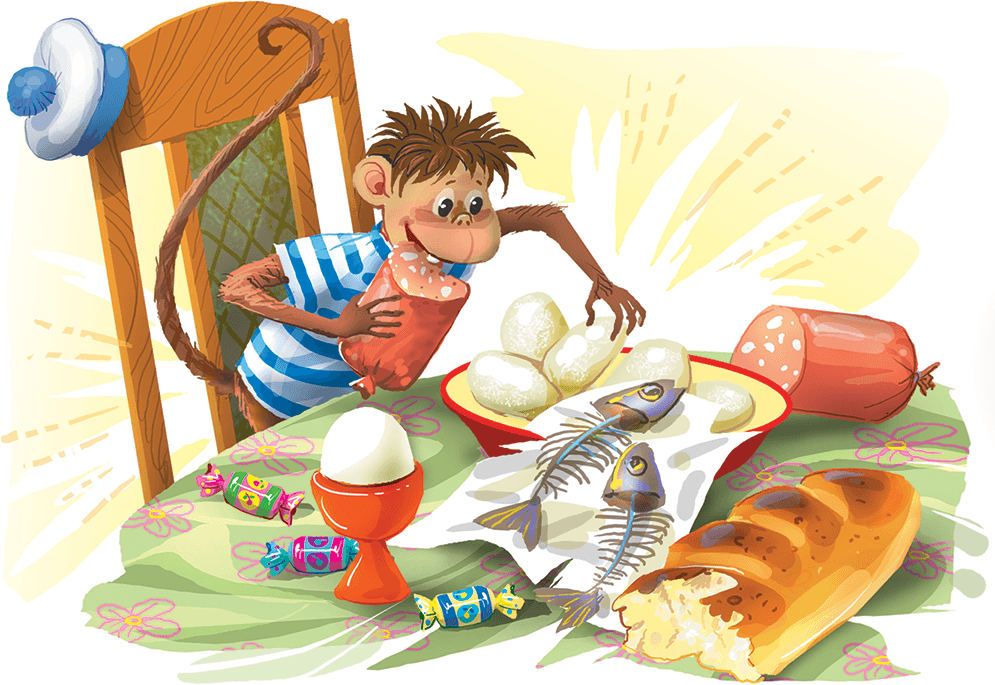 Обезьянка как начнет есть! Сначала колбасу, потом хлеб, потом варёную картошку, потом сырую, потом селёдочные очистки в бумажке, потом варёное яйцо в скорлупе прямо со скорлупой.