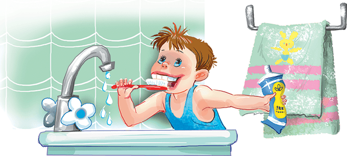 – Итак, выдавили пасту на щётку и стали чистить зубы. Вот так – сверху вниз. Маруся Петрова, правильно. Виталик Елисеев, правильно. Вера, правильно. Анфиса, Анфиса, ты что делаешь? Кто тебе сказал, что зубы надо чистить на люстре? Анфиса, не посыпай нас зубным порошком! А ну-ка, иди сюда!