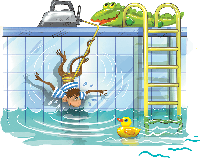 Анфиса тоже в воду захотела. Она к краю бассейна подошла и как свалится вниз! Только она до воды не долетела. Её утюг не пустил. Он на полу лежал, и провод до воды не доставал. И Анфиса около стенки болтается. Болтается и плачет.