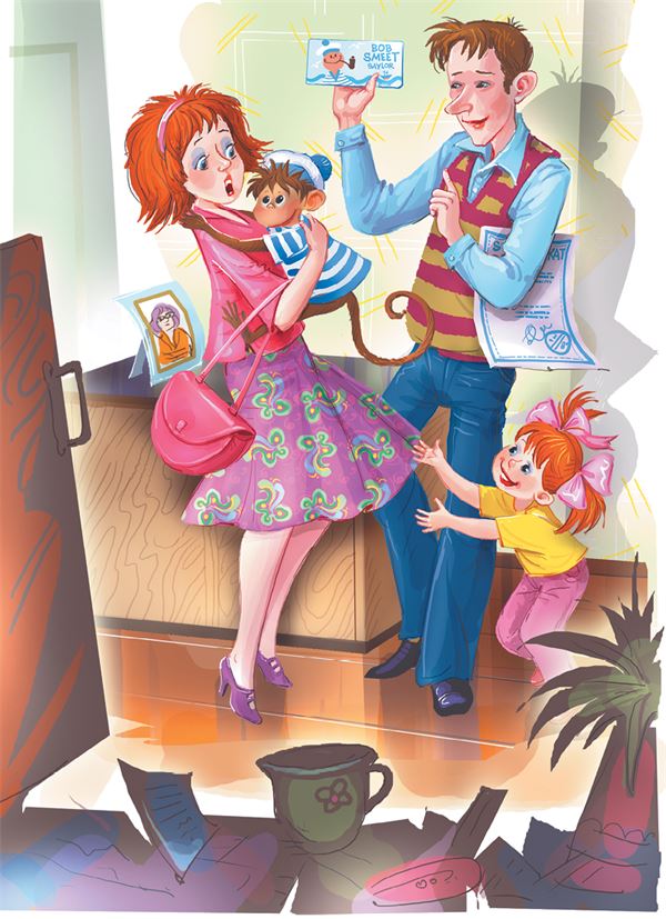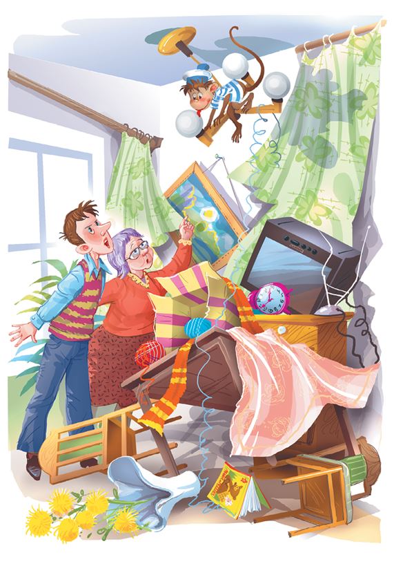 И точно: все табуретки, все столы и даже телевизор – всё в квартире вверх ногами поставлено. А на люстре обезьянка висит и электрические лампочки облизывает.