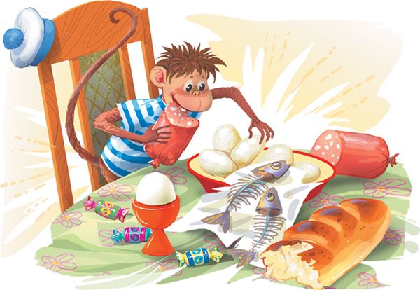 Обезьянка как начнёт есть! Сначала колбасу, потом хлеб, потом варёную картошку, потом сырую, потом селёдочные очистки в бумажке, потом варёное яйцо в скорлупе прямо со скорлупой.