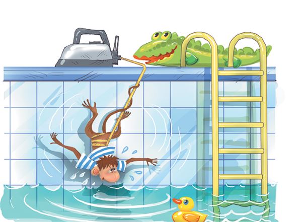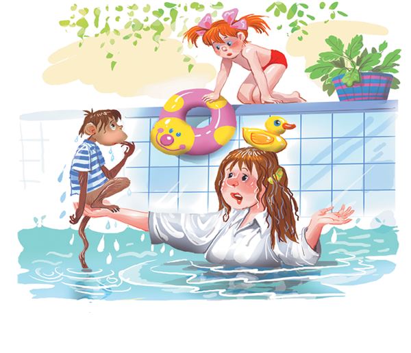 Анфиса тоже в воду захотела. Она к краю бассейна подошла и как свалится вниз! Только она до воды не долетела. Её утюг не пустил. Он на полу лежал, и провод до воды не доставал. И Анфиса около стенки болтается. Болтается и плачет.