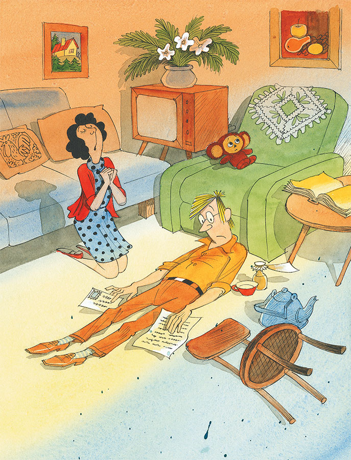 Тут грохот в комнате раздался. Это папа в обморок упал. Теперь мама за водой побежала, папу в чувство приводить.