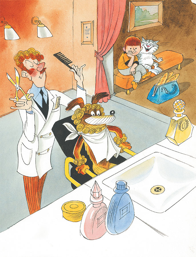 Наконец они к парикмахерской подъехали. Кот в тракторе остался – сторожить, а дядя Фёдор с Шариком стричься пошли. В парикмахерской чисто, уютно и светло, и женщины сидят под колпаками, сохнут. Парикмахер спрашивает у дяди Фёдора: