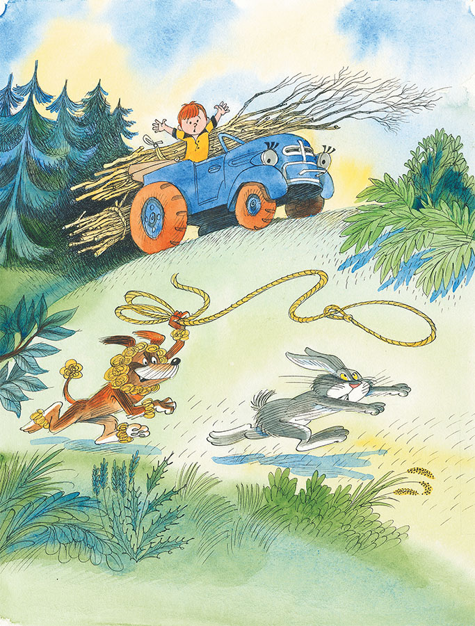 Покормили они трактор и решили домой ехать. А тут заяц мимо бежит. Шарик как закричит: