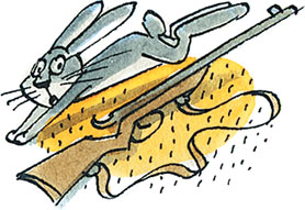 Вынес он потихоньку Шарикино ружьё, подкрался к зайцу – и как над ухом у него пальнёт! Заяц аж подпрыгнул! Лапками он в воздухе заработал и с места пулей – раз! Сам Матроскин не меньше перепугался – и пулей в другую сторону. Только ружьё в серединке лежит и дым кверху пошёл синенький.