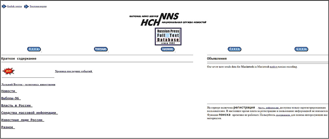 На первом этапе Интернет оставался еще очень ограниченным и недоступным большей части аудитории; поэтому основной вклад в распространение новой технологии вносили любители, которые начали осваивать незнакомое пространство. Для СМИ выход в сеть был еще не более чем экспериментом. Пионером в этом оказалась «Учительская газета», открывшая свой сайт в 1995 г. У него не было ни дизайна, ни иллюстраций, ни рубрикации. Чуть позже в сеть вышла «Национальная служба новостей» (рис. 5), которая в 1996 г. организовала онлайн-трансляцию подсчета голосов избирателей во время выборов президента. Тогда же в Рунете появились сразу три интернет-радиостанции: «Серебряный дождь», «Европа плюс» и «Радио 101».