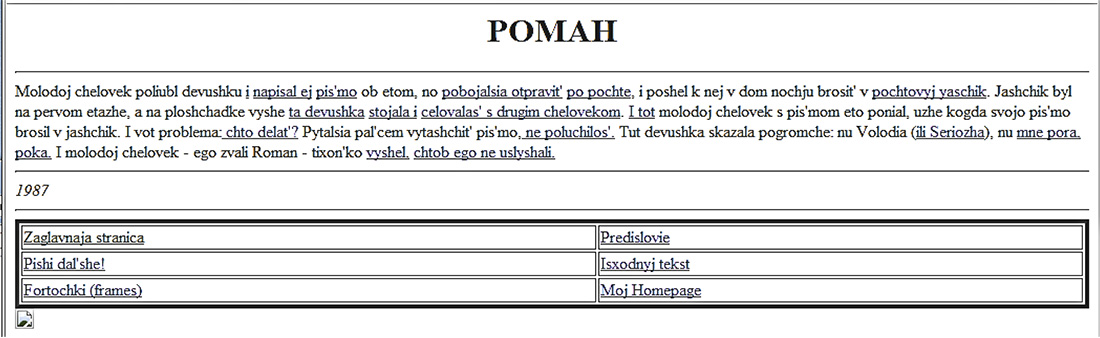 На этом же этапе мы видим интенсивное развитие литературных проектов и веб-обозрений. Интернет оказался плодотворной средой для литературной игры, наглядным воплощением принципов постмодернизма. Так возникают проект Романа Лейбова «Роман» (рис. 6), участники которого писали текст произведения, продолжая друг друга с любого места, или сайт «Сад расходящихся хокку», где нужно было создать стихотворение, начинавшееся с последней строки предыдущего.