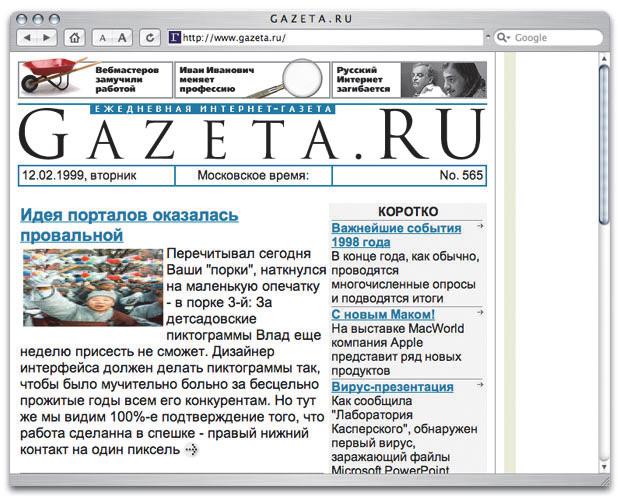 В 1999 г. вышла «Газета. ru» (рис. 7), довольно быстро завоевавшая интерес читателей, вслед за ней появились Lenta.ru, «Страна.ру». Тогда же «Независимая газета» запустила онлайн-версию и открыла доступ ко всем материалам свежих номеров. История российского телевидения в Интернете началась с создания сайта НТВ. В качестве иллюстраций к новостям здесь стали использовать кадры из телесюжетов. Очередным переломным годом стал 2001-й, когда «РИА Новости» начало публиковать материалы для всех читателей, изменив традиционный способ работы информационных агентств.