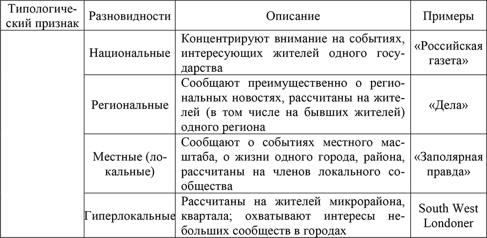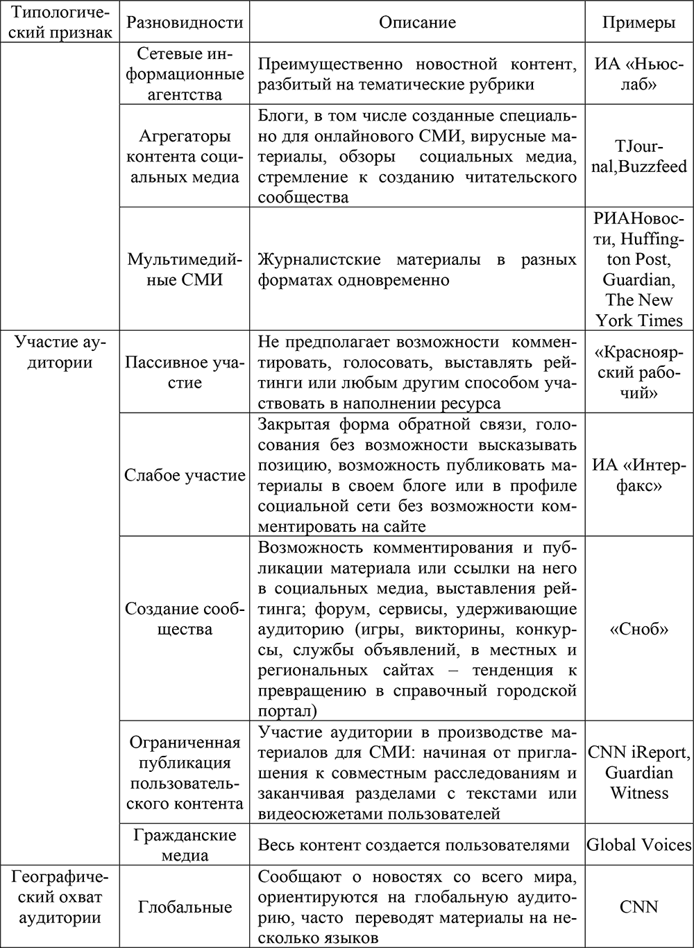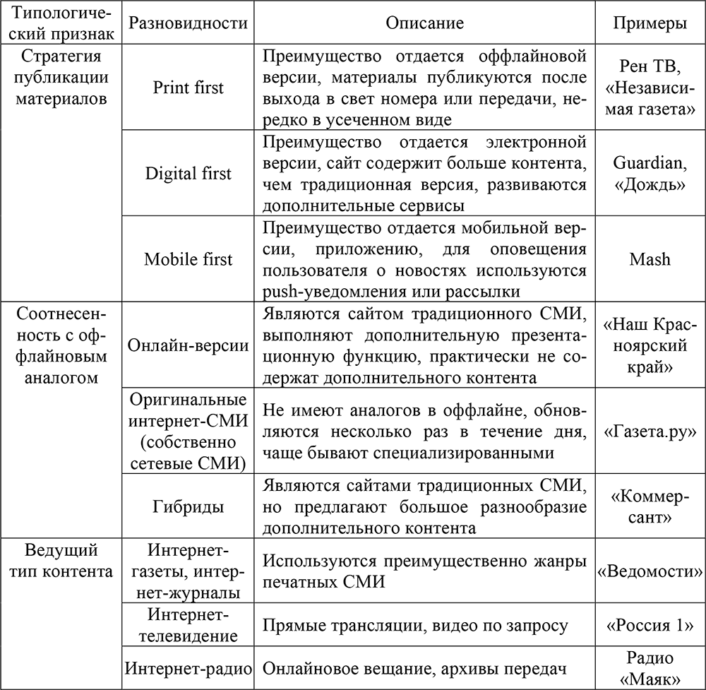 В табл. 2 приведены только те признаки, которые отличают онлайновые СМИ от традиционных. Общие для всех типов СМИ признаки: охват действительности, тип собственника, аудитория, тематика и др. – в дополнительных комментариях не нуждаются.