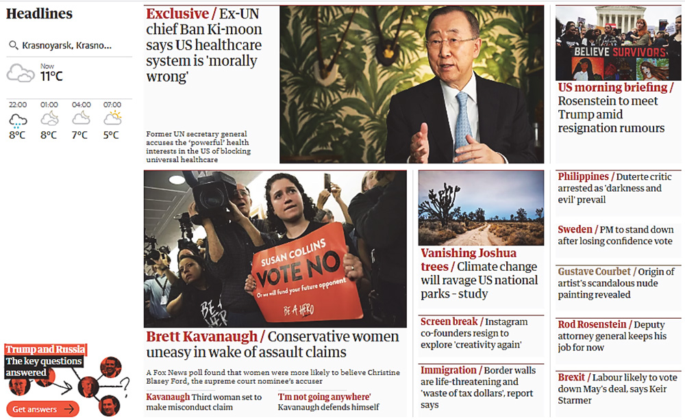 Многие интернет-СМИ экспериментируют с рубрикацией, превращая способы организации контента в свои оригинальные черты. Так, в 2015 г. Guardian презентовала систему контейнеров, соединив навигацию и дизайн. Контейнеры – это горизонтальные блоки во всю ширину экрана, куда собраны материалы. Каждый контейнер фактически выступает в виде динамической рубрики, куда попадают материалы по соответствующей теме или важнейшие материалы дна. Блоки отделены друг от друга графически и расположены по степени важности. Они могут появляться на любой странице (рис. 12).