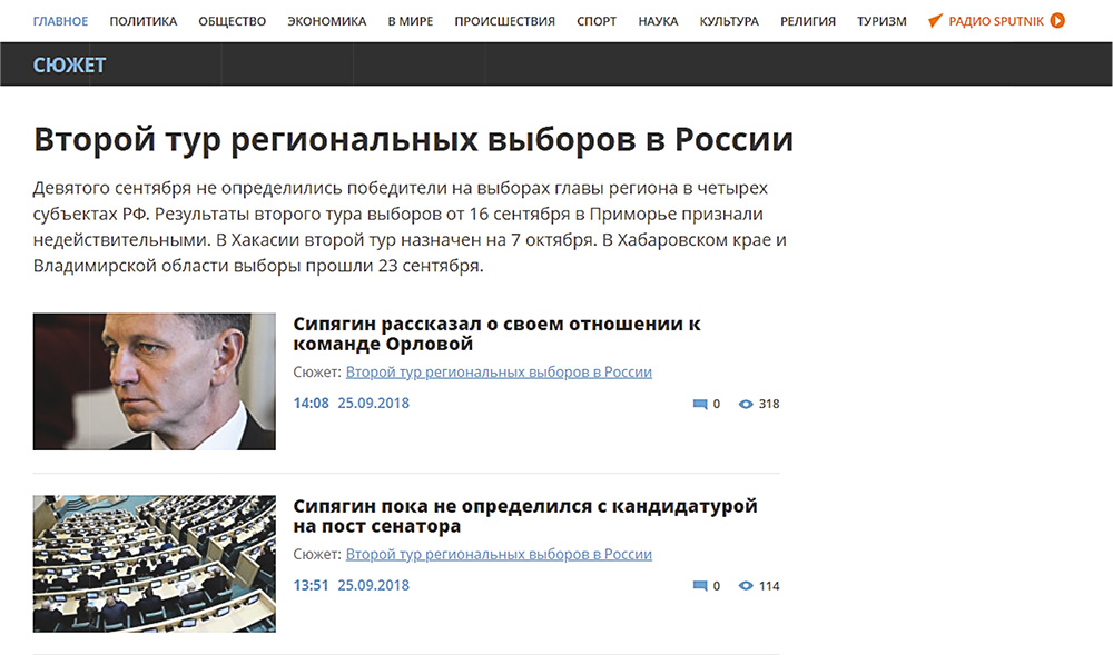 Рис. 14. Сюжет «Второй тур региональных выборов» на сайте «РИА Новости»