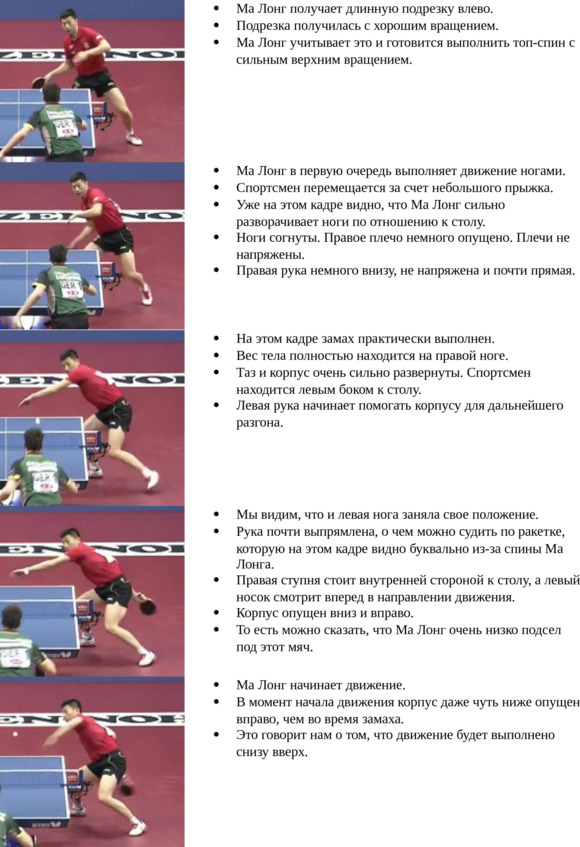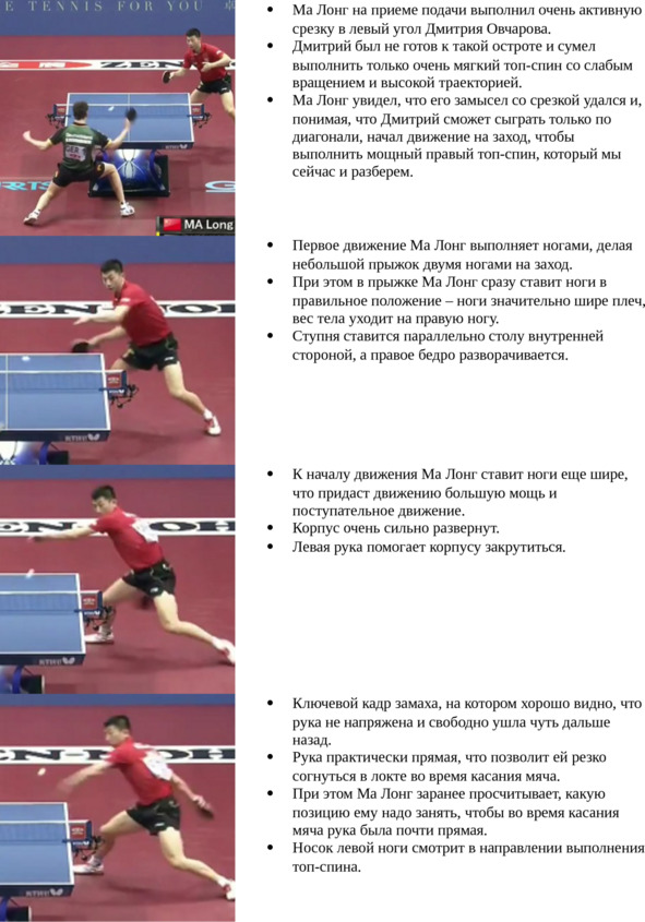 Основным нюансом выполнения топ-спина по такому мячу является постановка ног. Если при топ-спине с обычной подрезки мы ставим левую ногу чуть впереди правой, то здесь – все наоборот. Мы делаем полшага вперед правой ногой и только после этого выполняем топ-спин.