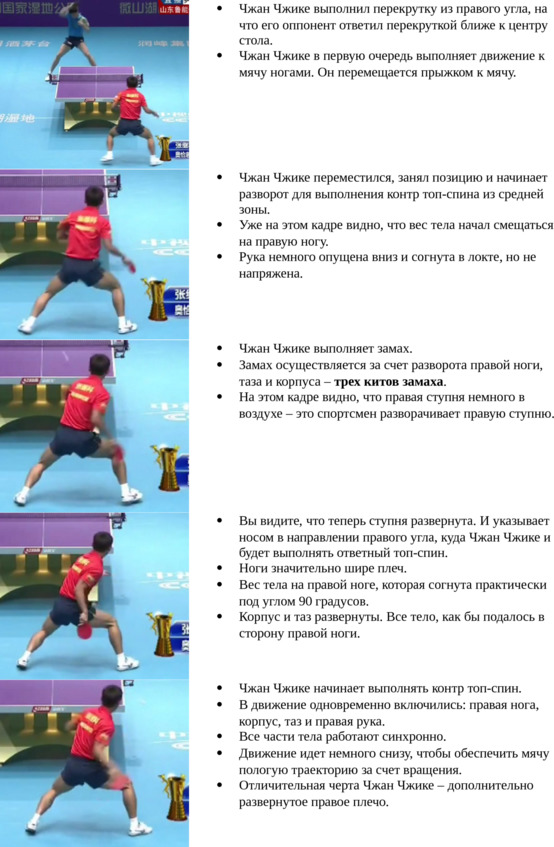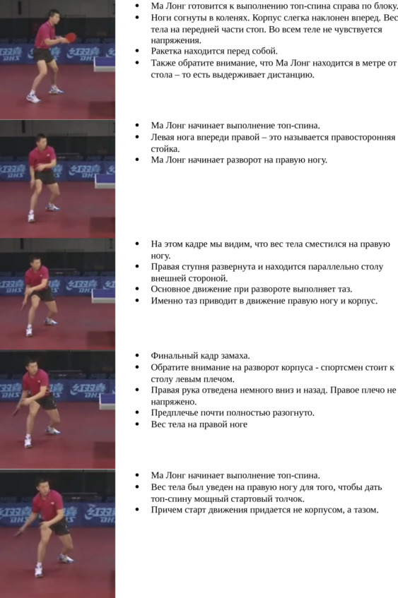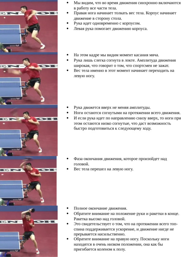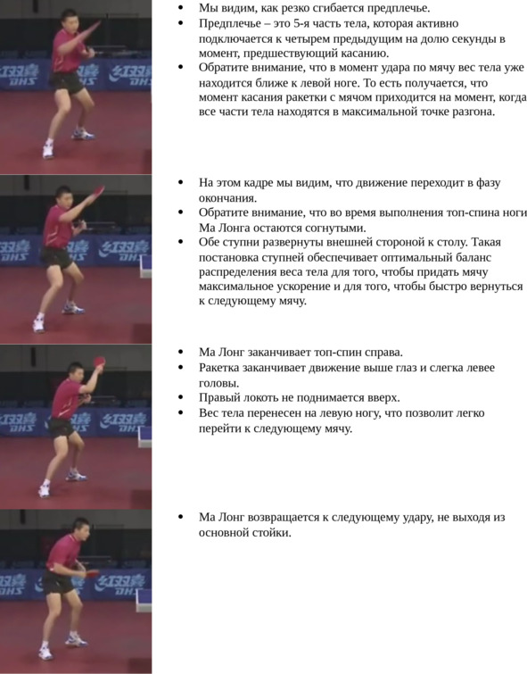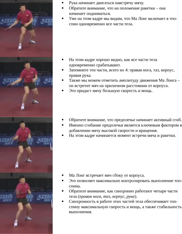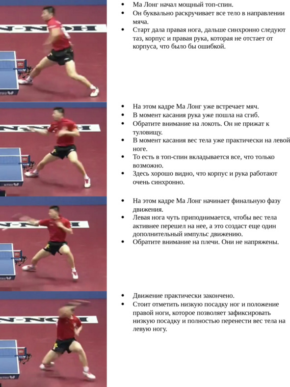 Еще раз обращаем ваше внимание, что при мощном топ-спине справа одновременное включение в топ-спин четырех частей тела (правая нога, таз, корпус, правая рука), про которые упоминается в комментариях к фотографиям, становится определяющим фактором. При малейшей несинхронности включения этих частей тела мощный топ-спин справа не получится.