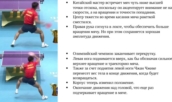 То есть топ-спин справа с подрезки требует значительно большего усилия, чем топ-спин по блоку. Более широкое движение необходимо именно для того, чтобы обеспечить это усилие.
