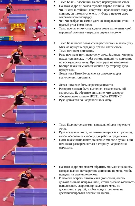 Какая же эта ситуация? Самое интересное, что для каждого спортсмена существуют «свои» подходящие моменты. Один выполняет мощный топ-спин справа только по мячам, которые поднимаются несколько выше обычного, а другой может выполнить завершение атаки сразу же после первого топ-спина с подрезки. А кто-то вообще имеет способность и умение выполнить топ-спин на выигрыш очка сразу же после подачи. Все это зависит от взрывных качеств, чувства мяча, общих способностей, привычек и модели игры спортсмена.