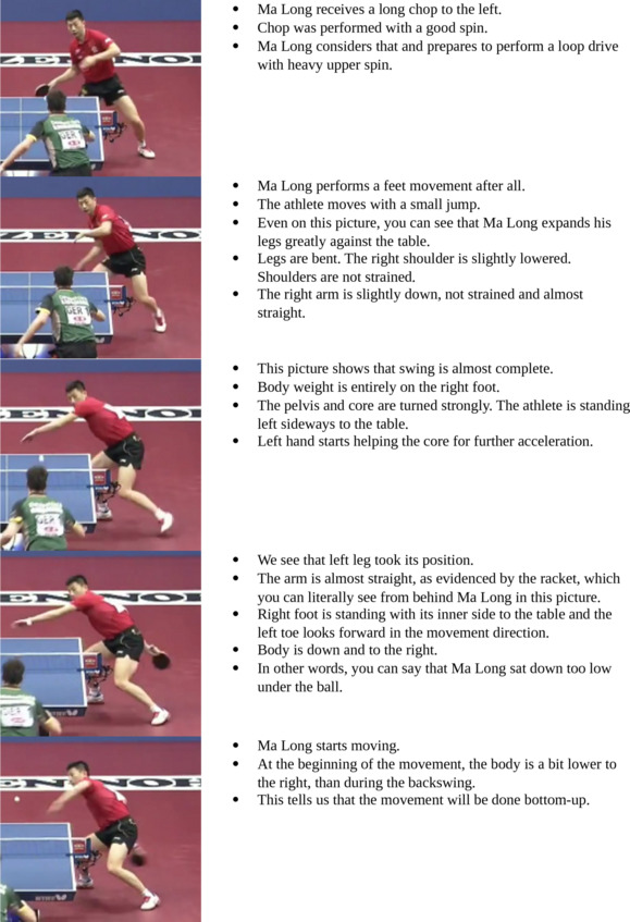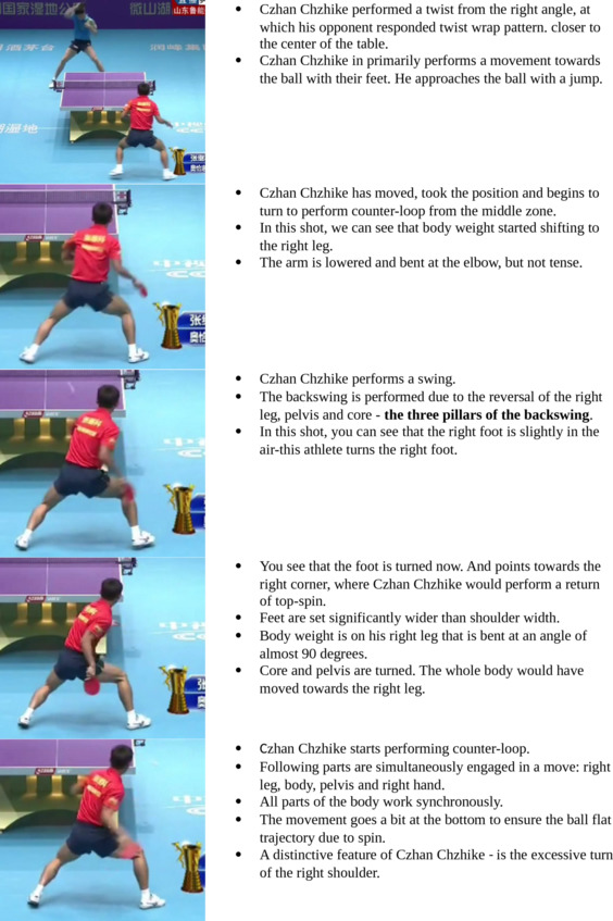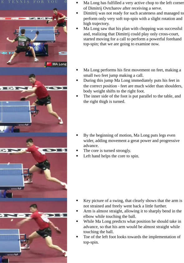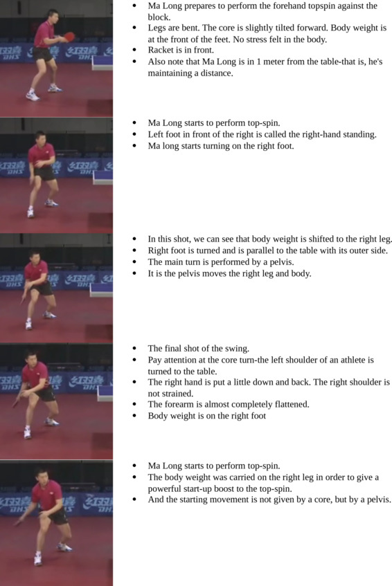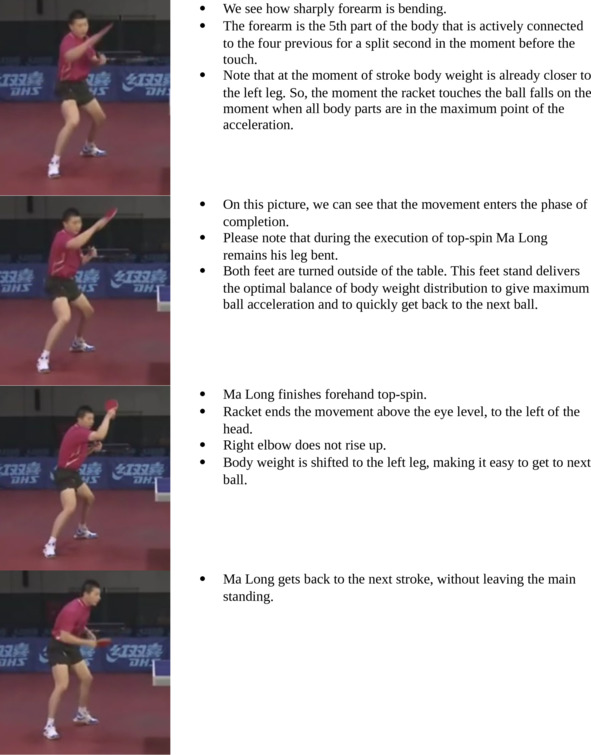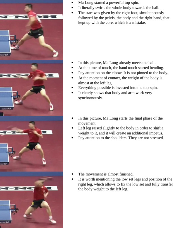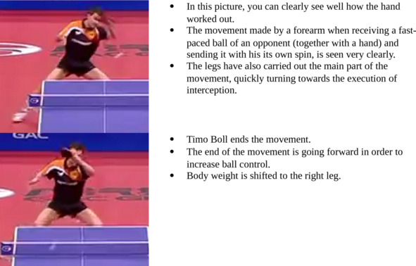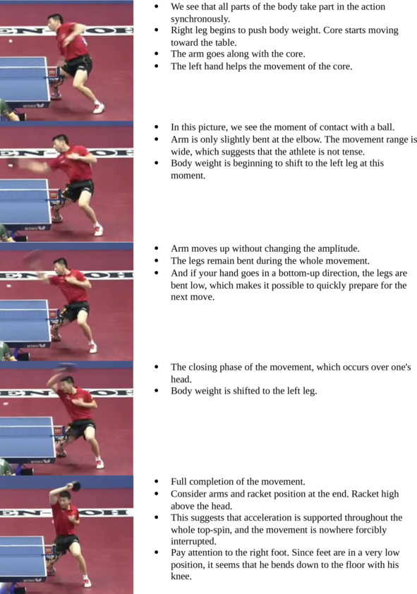 Once again we draw your attention to the simultaneous inclusion of the four parts of the body at the powerful forehand top-spin (right leg, pelvis, core, right hand), which is mentioned in the comments to the pictures, becomes the determining factor. At the slightest non-sync of these parts of the body a powerful forehand top-spin is impossible.
