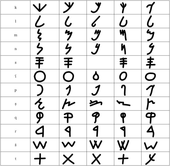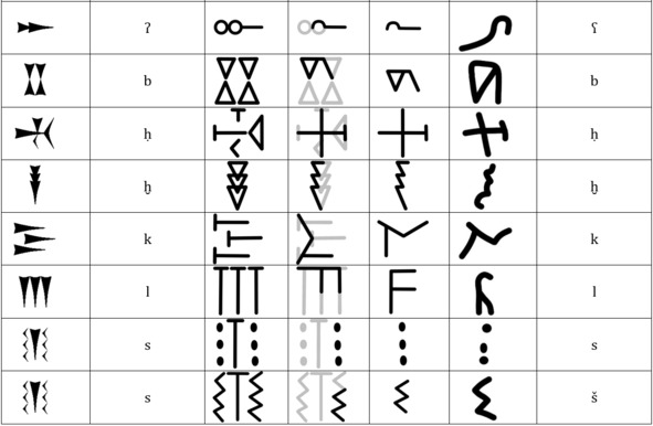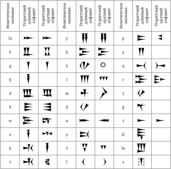 Как видно из таблиц, представленных ниже, финикийские знаки довольно логично укладываются в русло моей теории о происхождении всей буквенно-звуковой письменности из угаритского алфавита. Все они, за исключением айна, подразделяются на четыре группы: основанные на элементе КоТ, основанные на элементе ГПШ, основанные на элементе ГКШ и графемы вторичного образования – те чьими прототипами стали буквы этого же алфавита.