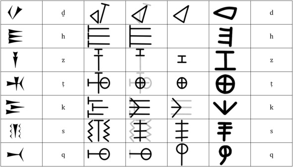 Таблица 12. Происхождение формы лахишских знаков (письмо Лахиш А).