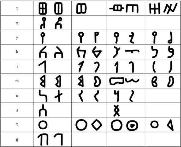 Таблица 9. Происхождение знаков южноаравийского (минеосабейского) письма (схематизации на основе элемента КоТ).