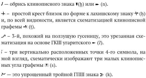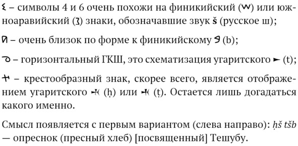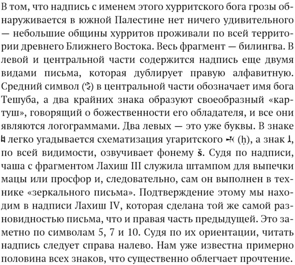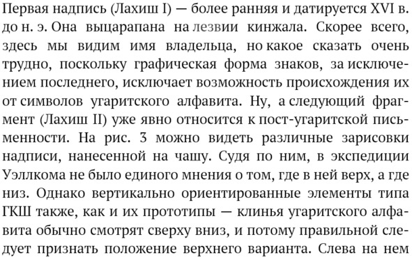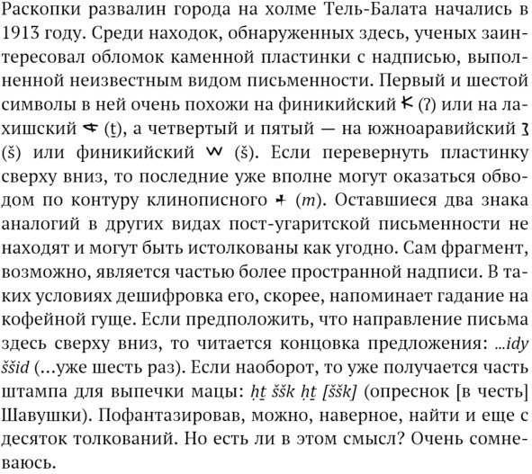 Письменные фрагменты II тысячелетия до н. э., найденные в Палестине, обычно объединяют под обобщающим термином протоханаанское письмо. Самые древние относят к XVIII—XVII векам до н. э. Все они до сих пор не имели общепризнанной, устраивавшей всех дешифровки, благодаря чему эта глава может стать моментом истины для моего предположения. Ведь если нам с помощью гипотезы об угаритском письме как предке всей буквенно-звуковой письменности удастся прочесть хотя бы одну из них, то этот факт станет веским аргументом в пользу его. И тогда можно будет считать, что оно по крайней мере имеет право на жизнь. По логике с этого места к работе требовалось бы, конечно, привлечь профессионального семитолога или лингвиста, но среди моих знакомых таковых не оказалось, так что пришлось обходиться своими силами. Согревает душу мысль – если повезет, и книга привлечет внимание значительного числа читателей, то критики обязательно найдутся и на ошибки мне укажут.