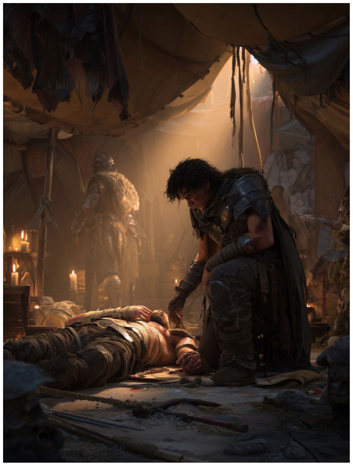 Зельница тут же отпрянула и, поднявшись, встала по центру палатки, уперев руки в бока. От этого ему открылся взор на появившуюся компанию, где, как он и предположил, был молодой парень с трубками из святых символов за спиной, мужчина в годах и седой бородой и совсем юный безусый мальчишка, но одетый как вой. Тот, что с седой бородой, так же громко сказал: