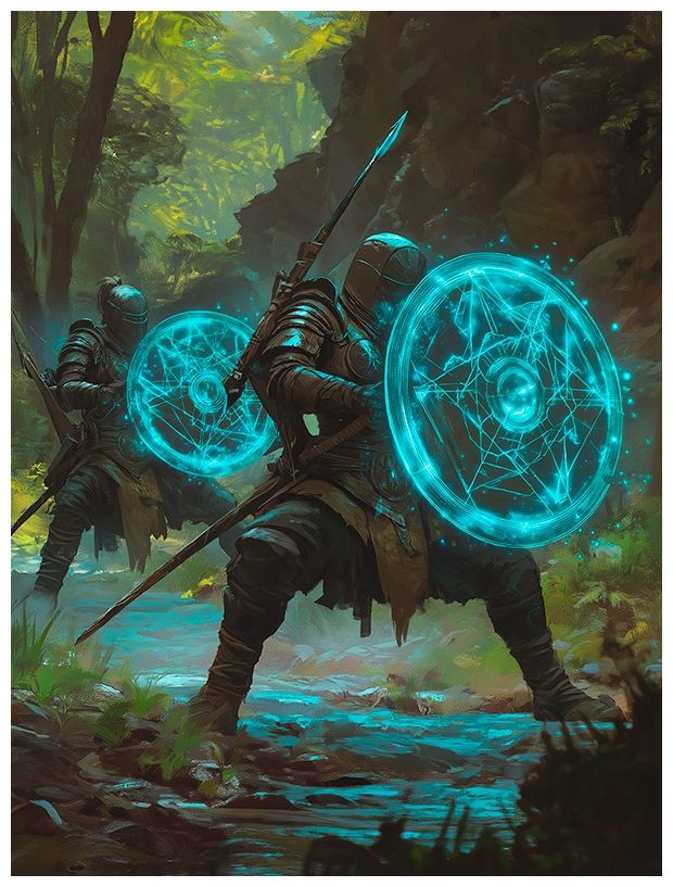 В это время обоз полностью остановился, не дойдя до места засады метров десять, и воины встали в круговую оборону, выставив наружу щиты и короткие копья, а узоры на их броне начали ярко светиться. Погонщик тоже времени не терял: отложил поводья, спрыгнул на дорогу и вытащил из-под тента телеги двуручный молот с такими же светящимися узорами. Но больше всего удивил старик, так как из ножен на бедре в его руке появился продолговатый предмет, похожий на толстую, но короткую палку, а через мгновение на торце этой палки сформировалось длинное плоское лезвие, также состоящее из геометрических узоров.