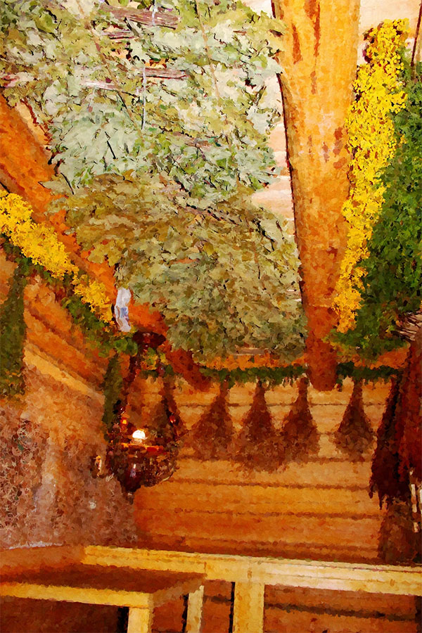 В комнате отдыха не было привычных кожаных диванов, так любимых в саунах. Только широкие лавки из толстых осиновых полубревен, на которых лежали матрацы с душистой травой, застеленные простынями. Сама же комната была увешена травами, да так сильно, что, казалось, была сделана из них. Основную часть потолка занимали различные веники, обрамлённые золотой пижмой, рубиновыми вкраплениями ягод рябины да белой бахромой ромашки. А какой при этом стоял аромат!