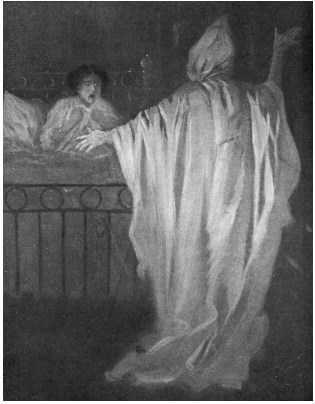 The nose and eyes were cut; a grinning mouth and devilishly curved eyebrows were added with burnt cork. The pillow slip was tied firmly about her neck to allow no chance of slipping, the ears waved lopsidedly; she was the most amazing specter that ever left a respectable grave.