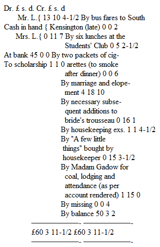 From this it will be manifest to the most unbusiness like that, disregarding the extraordinary expenditure on the marriage, and the by no means final "few little things" Ethel had bought, outgoings exceeded income by two pounds and more, and a brief excursion into arithmetic will demonstrate that in five-and-twenty weeks the balance of the account would be nothing.