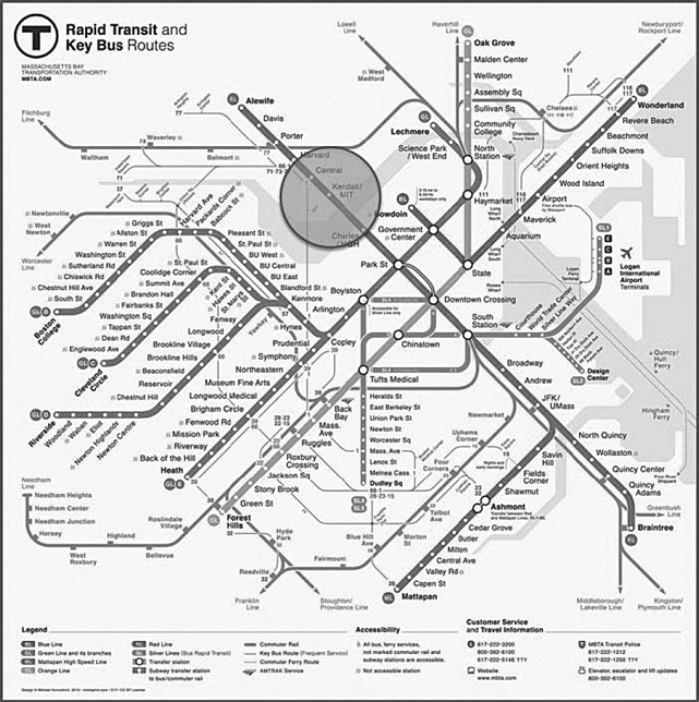 Рисунок 6.1 демонстрирует карту метро до переделки. Кружком обведена станция Kendall/MIT на красной линии – именно здесь находится Массачусетский технологический институт, где работает Рут.