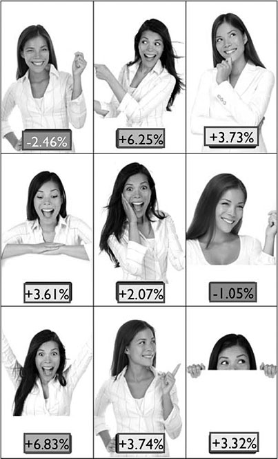 Рисунок 7.3 показывает остальные фигурировавшие в эксперименте изображения. На каждом из них указано, как изменялся процент среагировавших на призыв посетителей по сравнению с базовой картинкой. Красные цифры означают ухудшение показателей, а вот зеленый цвет говорит о том, что изображение сработало намного лучше базового.