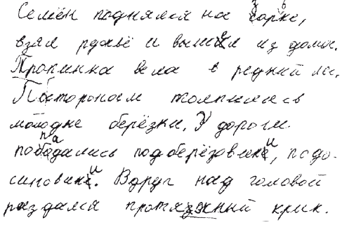Рис. 1.2.2. Трудности письма, связанные с легким отставанием в развитии функций программирования и контроля (ошибки в первой, второй и трех последних строчках)