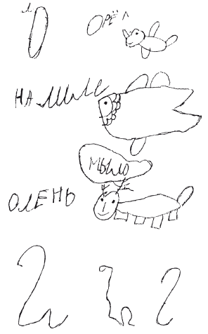 Рис. 1.2.6. Трудности рисования и написания слов и цифр у первоклассницы со слабостью переработки зрительной информации