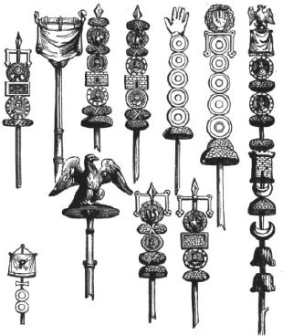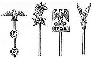 До реформы Мария штандартом римского легиона, наряду с изображением орла, могли быть и иные изображения – волчицы, коня, кабана, льва, быка, богини победы Виктории и даже легендарного человекобыка Минотавра. Но Гай Марий и здесь ввел столь любимое им единообразие. Хотя следует заметить, что изображение орла варьировалось от легиона к легиону (в отличие от орлов на древках полковых знамен армий наполеоновской империи, введенных гениальным корсиканцем в подражание Марию). У более мелких подразделений римской армии – когорт, манипулов, центурий, кавалерийских турм – имелись свои боевые значки, отличавшиеся от легионных.