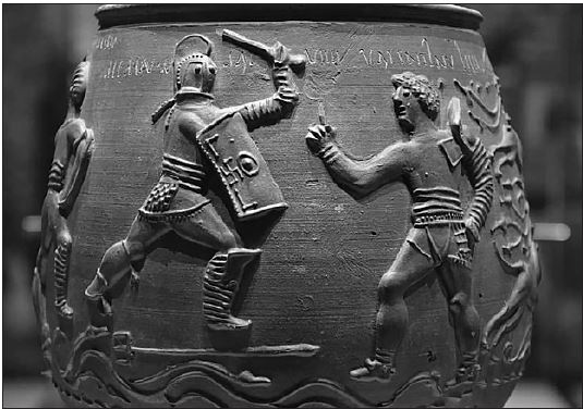 Бой гладиаторов (изображение на римском бронзовом сосуде)
