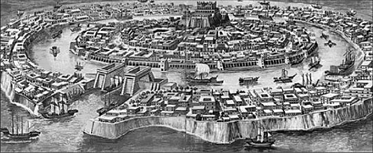 «Конунг (король – В. А.) решил послать людей, чтобы те нашли Пальнатоки и пригласили его к нему и сказали, что конунг будет ему другом. Конунг добавил к приглашению, что предлагает ему землю под названием Йом в его стране и обеспечит его поселение там, а за это Пальнатоки будет защищать свою округу и всю страну. Пальнатоки принял предложение и поселился там со своими людьми. Вскоре там был построен большой, хорошо укрепленный град. Часть города находилась на мысу и окружена была морем. Там была гавань, где могло разместиться триста шестьдесят длинных ладей (военных «длинных кораблей» – «лангскипов», или «драккаров», о которых будет еще подробнее сказано на дальнейших страницах нашего правдивого повествования – В. А.), да так, что все они находились бы под прикрытием городских укреплений (то есть крепостные стены Йомсборга опоясывали гавань наподобие кольца, напоминая этим порт Посейдониса-Посейдониды, столицы платоновской Атлантиды – В. А.). Все там было устроено так хитро, что вход в гавань перекрывала большая каменная арка. На входе в бухту были установлены железные ворота, которые запирались изнутри. На вершине арки стояла башня, в которой были установлены камнеметы (метательные машины-катапульты, или «аппараты», как их называли древние греки – В. А.). Город звался Йомсборг». («История Оркад, Дании и Йомсбурга». Туле. Древние нордические сказания и поэмы. Серия 2, том 19. Йена, 1924 год).