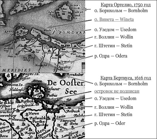 Подобных свидетельств имелось немало. В XVIII столетии один энтузиаст-чиновник узрел на месте предполагаемых развалин погибшего ненастною ноябрьской ночью города развалины казарм, здания адмиралтейства и даже остатки пушек (!), так что вплоть до середины XIX века не только на страницах книг энтузиастов-одиночек, но и на военных картах Генерального Штаба прусской королевской армии указанное место обозначалось, как «руины Винеты». Однако еще ранее, в XVI–XVIII веках, многие картографы, слишком легко поверившие фантазиям чрезмерно впечатлительных наблюдателей, среди других, реально существующих, населенных пунктов, изображали на северном побережье острова Узедом, а порой – в акватории между островами Узедом и Руден – «Винету, торговый порт, поглощенный морем и находящийся ныне под водой». Однако плоды их творчества, вне всякого сомнения, имеют скорее культурно-историческое, чем подлинно историческое значение, не являясь серьезным подспорьем в поисках происхождения легенды о Винете.