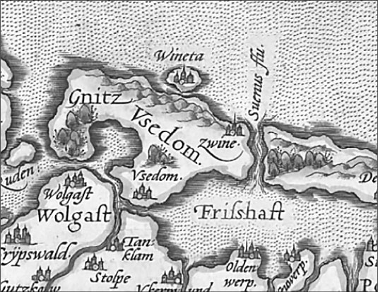 «И это доподлинно так, в чем всякий может убедиться и сегодня. Ибо если кто-нибудь пожелает переправиться из Вольгаста через реку Пеене (Пену – В. А.) и отправиться в землю (так он называет остров – В. А.) Узедом, и прибудет в окрестности деревни под названием Дамеров, то увидит там часть большой дороги, ведущей прямо в море и видимой даже сквозь толщу воды (ибо с тех пор море затопило большую часть суши), большие камни и фундамент. Так и я вместе со многими другими ездил туда и сам видел все это. Однако целых стен там не осталось, ибо со времени разрушения города прошло так много столетий, что невозможно было стенам устоять под напором волн бурного моря столь долгое время. Однако же большие камни от фундаментов все еще сохранились, расположенные все еще так, как располагаются они обычно под домами…один рядом с другим, а в некоторых местах – и один на другом… Среди них в трех или четырех местах есть камни, столь огромные, что выступают на локоть или еще выше из воды, и можно, по трезвом рассуждении, помыслить, что там стояли некогда их церкви или ратуши… Местные же рыбаки уверяли нас, что там сохранились участки вымощенных камнями улиц, поросшие мхом, а также занесенные песком, и потому не доступные взору человека… И, проезжая в разных направлениях мимо этих фундаментов, стараясь запомнить расположение улиц, мы убедились в том, что город был вытянут в длину, и простирался он в длину с востока на запад… Увиденное позволило нам предположить, что размером он был с город Альт-Любек (Старый Любек[17] – В. А.), ибо в длину лишь на четверть был доступен обозрению, ширина же его превышала ширину старого города Любека. Можно представить себе размеры той части города, которую мы не увидели, ибо она ушла под воду» («Хроника Померании на верхненемецком диалекте», том I, Штеттин, 1898 год)[18].